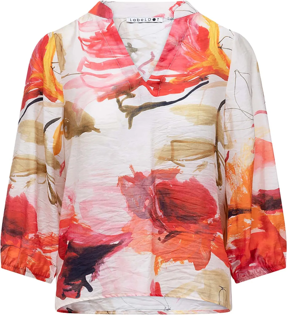 Blouse Aman van Label Dot is een blouse met V-hals, regular pasvorm en 3 kwart mouwen met elastische manchetten. Het bloemenpatroon heeft een aquarelachtige print in rood, oranje en beige. Draag los op een jeans of ingestopt in een high-waist broek voor een casual, trendy outfit.