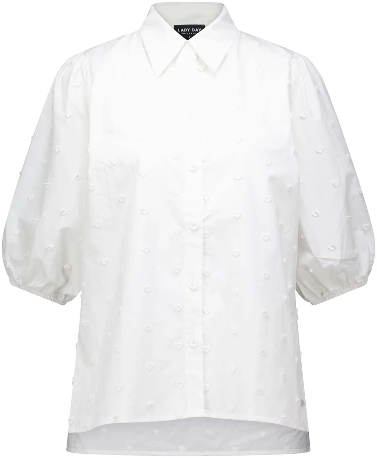 Blouse Eve van Lady Day is een stijlvolle dames blouse km met hartjespatroon en button down kraag. De korte mouwen hebben elastische manchetten, wat zorgt voor een comfortabele losse pasvorm. Ideaal voor casual gelegenheden, deze blouse combineert moeiteloos stijl en gemak met knoopsluiting en klassieke overhemdkraag.
