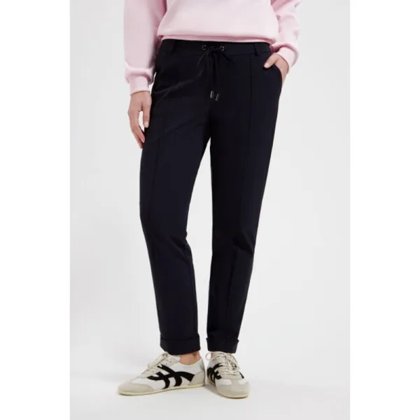 Deze Lady Day broek in donkerblauw is gemaakt van hoogwaardige travel kwaliteit en staat bekend om haar comfortabele en verzorgde uitstraling. De broek heeft een elastische boord met riemlussen en een koordje voor een perfecte pasvorm. De siernaad op de voorkant en de omslag aan de pijpen geven het model een elegante en moderne look. De soepele, elastische stof is kreukvrij en ideaal voor dagelijks gebruik, werk of reizen. Een veelzijdige broek die moeiteloos te combineren is met een blouse, blazer of sweater. Kenmerken Kwaliteit: Travel stof 80% polyamide 20 % elastaan Boord: Elastische boord met riemlussen Details: Siernaad op de voorkant, omslag aan de pijp Pasvorm: Comfort fit
