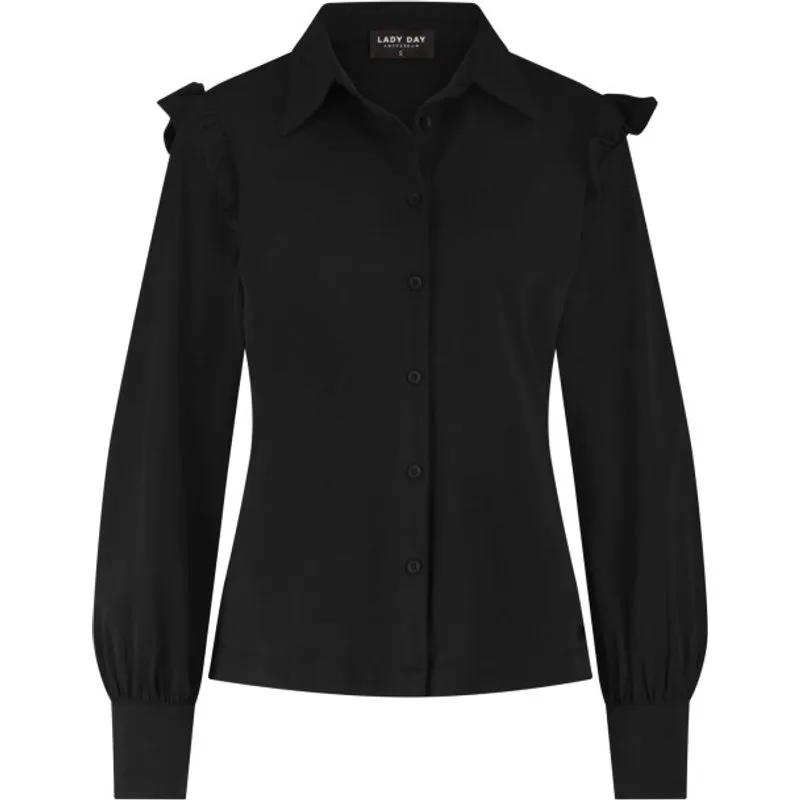 De Emma is een door-geknoopte blouse met lange mouw. De blouse heeft een normale kraag en heeft een volant detail over de voorkant van de blouse door over de schouders naar de achterkant. Leuk te dragen met verschillende items van Lady Day. Materiaal 80%polyamide/20%Elastane Lange mouw