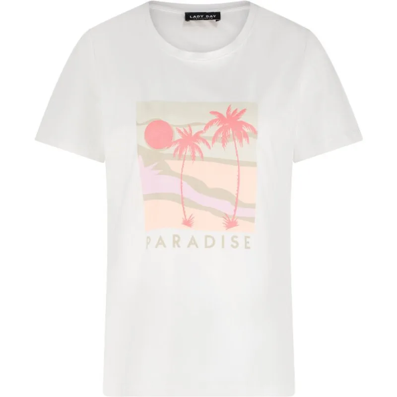 LADY DAY Evelyn vind je nu op To Be Dressed. Prachtig en uniek item van premium travelkwaliteit en gemaakt van de volgende materialen: 93% Cotton 7% EA. Het t-shirt Evelyn is een rechtvallend model met korte mouwen en ronde hals. De voorkant bedekt met gekleurde print.