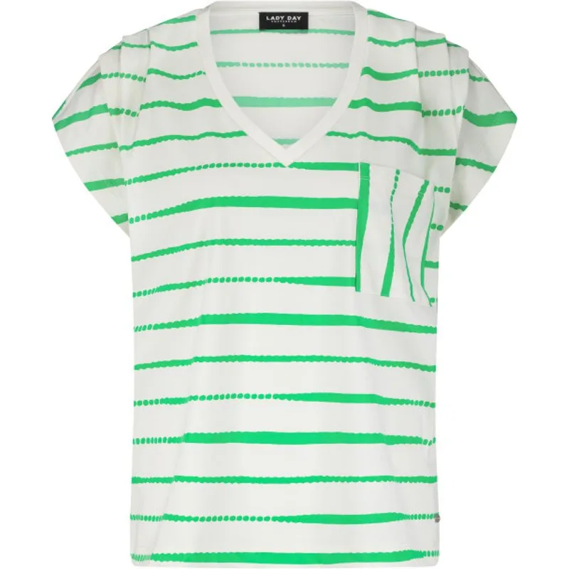 LADY DAY Kat vind je nu op To Be Dressed. Prachtig en uniek item van premium travelkwaliteit en gemaakt van de volgende materialen: . De top Kat is recht model met V-hals en een borstzak voorop. De top heeft korte mouwen en plooien op de schouders.