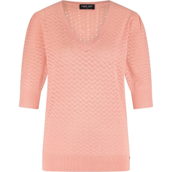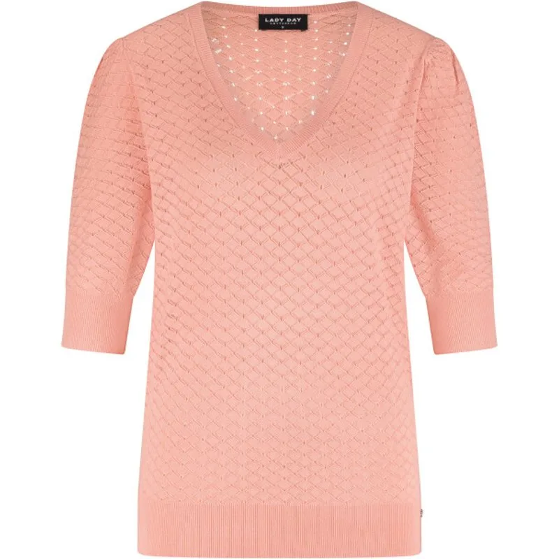 LADY DAY Libby vind je nu op To Be Dressed. Prachtig en uniek item van premium travelkwaliteit en gemaakt van de volgende materialen: . De Libby is een fijn gebreide knit met v-hals en korte mouw. Open gewerkt motief.