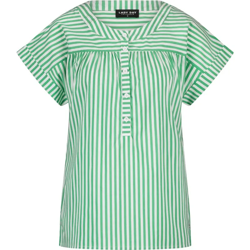LADY DAY Lina vind je nu op To Be Dressed. Prachtig en uniek item van premium travelkwaliteit en gemaakt van de volgende materialen: . De blouse Lina is een rechte blouse met aangeknipte mouw en ronde hals. Knoop sluiting tot halverwege de blouse. Gathering op voor en achterkant.