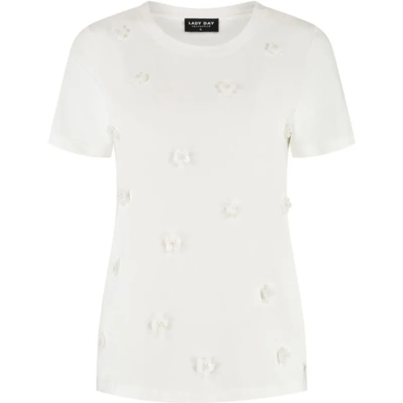 LADY DAY Lottie vind je nu op To Be Dressed. Prachtig en uniek item van premium travelkwaliteit en gemaakt van de volgende materialen: 95%cotton/5%EA. Het t-shirt Lottie is een rechtvallend model met korte mouwen en ronde hals. De voorkant is voorzien van bloem applicaties.
