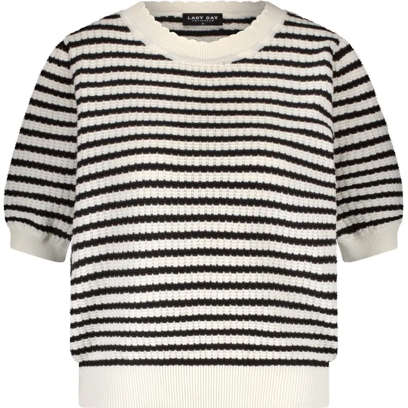 LADY DAY Sammy Stripe vind je nu op To Be Dressed. Prachtig en uniek item van premium travelkwaliteit en gemaakt van de volgende materialen: 100% Cotton. De top Sammy is een gebreide top met korte pofmouwen en ronde hals met scaloped randen.