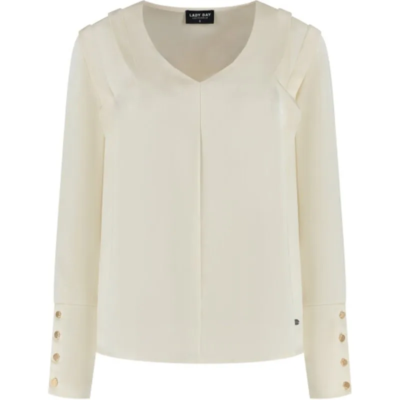 LADY DAY Sheri vind je nu op To Be Dressed. Prachtig en uniek item van premium travelkwaliteit en gemaakt van de volgende materialen: 100%polyester. De Sheri is een top met lange mouwen en V-hals. Het item heeft een satijnen look en mooie plooien aan voor- en achterzijde over de schouders. De top heeft een lang manchet met gouden knoopjes.