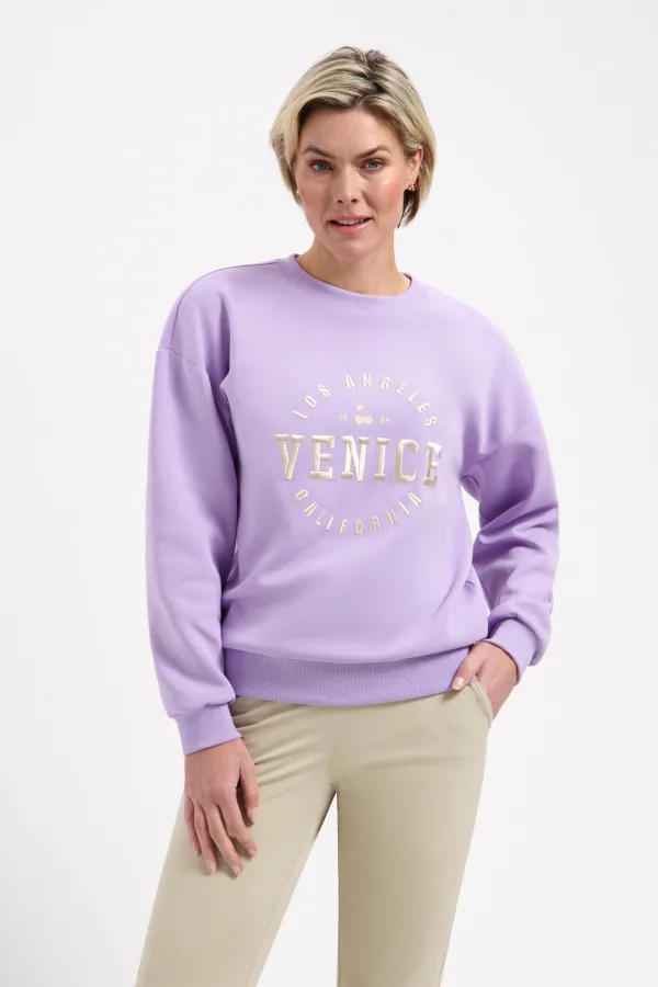 Comfortabele sweater met ronde hals en lange mouwen. De opdruk "Venice- Los Angeles California"geeft de sweater een sportieve en casual uitstraling. Perfect te combineren met een jeans of met je favoriete broek. Materiaal: 80% katoen 15% polyester 5% elastaan Ronde hals Lange mouwen