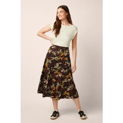 “Paradise found… in skirt form.” Deze zomerse midi rok is uitgevoerd in soepele en luchtige EcoVero viscose (stretcht niet!) in zwart, met een speelse palmbomenprint in oranje, mintgroen en mosterdgeel. Ze draagt heerlijk licht en zwiert prachtig met je mee. * Ritsluiting * Niet gevoerd * Valt bij een lengte van 1,70 m halverwege de kuit