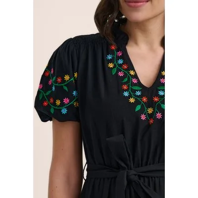 Je bent helemaal klaar voor de zomer met deze Lainey jurk! Ze heeft korte pofmouwen, een strikband in de taille en prachtig bloemenborduursel. Uitgevoerd in een soepele en luchtige, non-stretchy, zwarte viscose-/linnenmix die heerlijk draagt. Bloei op met Lainey! * Midi jurk * Korte pofmouwen * Afneembare strikband * Elastische taille * Zijwaartse steekzakken * Geen rits * Reikt tot halverwege de kuit bij een lengte van 1,70 m
