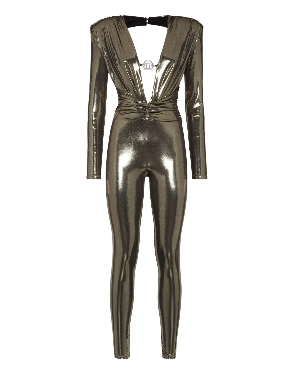 Flatteer je figuur met deze unieke jumpsuit met lange mouwen: perfect voor opvallende avondjes uit. Ontdek alle details. Gedrapeerde laméstof Diep uitgesneden V-hals met gesp met juwelen Gewatteerde schouders Halternek met twee knoopjes met juwelen op de rug Open rug Onzichtbare ritssluiting middenachter