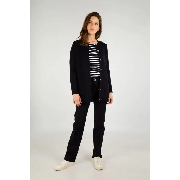 Een elegant jasje gebreid op MEC-MOR weefgetouwen die een zeer solide breisel met hoge dichtheid garanderen. Een knowhow van uitmuntendheid voor een uitzonderlijk product.Lang damesjackRonde halsMiddenvoor knopenlijstEmbossed knopen2 opgezette zakken aan de voorkantRibbed 1x1Totale hoogte voor een maat 1: 76 cmMaterialen50% Wol50% Acryl