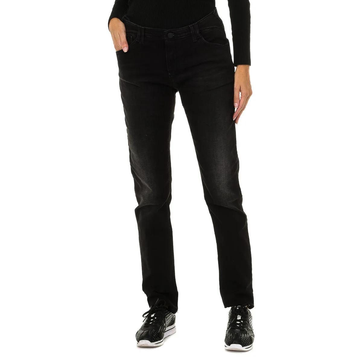 Lange jeans. Kleur Zwart Riem met riemlussen. Rits- en knoopsluiting aan de voorkant. Twee zakken aan de voorkant en een minizakje. Twee zakken op de achterkant met het metallic logo. Skinny pasvorm. Geweven effect. Stretchstof. Bijpassende zichtbare naden. Samenstelling: 99% Katoen - 1% Elastaan. Wasvoorschriften: - Maximaal wassen op 30ºC. - Strijken op gemiddelde temperatuur, max. 110 ° C. - Je kunt een droger gebruiken. - Gebruik geen bleekmiddel. - Kan niet chemisch gereinigd worden. Samenstelling: 99% Katoen, 1% Elastaan Onderhoud: Maximaal wassen op 30ºC. - Strijken op gemiddelde temperatuur, max. 110ºC. - Kan in de droger. - Geen bleekmiddel gebruiken. - Kan niet chemisch gereinigd worden.