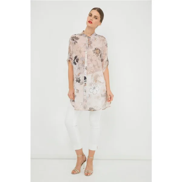 Lang zomerhemd van gedrukte stof, 100% katoen poplin. ¾ mouwen die opgerold kunnen worden en met de tab en knoop aan de mouw kunnen worden vastgemaakt. Rechtdoor 3 cm hoge kraag. 3 cm brede lijst aan de voorkant, 100% katoen. Sluit met decoratieve schelpknoopjes. Afgeronde ongelijke zoom, 5 cm langer aan de achterkant. Hoge zijsplitten, 20 cm. Subtiele A-lijn silhouet. Ons model is 178 cm en draagt maat 36. Maatgegevens voor maat 38 (in cm): Borst-51; Lichaamslengte-88; Taille-56; Schouderbreedte-44; Zoom-62; Mouwlengte-35. Het kledingstuk heeft een losse pasvorm.