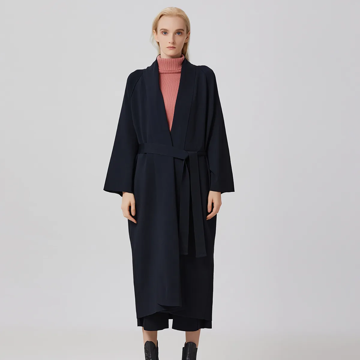 Een vest met een Japanse look dat reikt tot halverwege de kuit, gesneden in een fijn en dicht breisel: het is gestructureerd met een sjaalkraag met brede revers die tot aan de zoom vallen. Wijd uitlopende raglanmouwen en strikceintuur. Door zijn minimalistische stijl is hij zeer veelzijdig en kan hij over elk type outfit worden gedragen, casual of meer verfijnd. Productdetails: Vorm: trapeze, los Lengte: 114 cm Sjaalkraag Lange mouwen Geen knoopsluiting: riem om te strikken