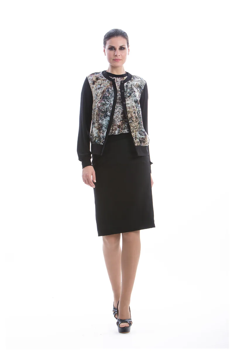 Cardigan CONQUISTA in zwart viscose-elastan stof met aan de voorkant bedrukt polyester. Lange mouwen en een knoopsluiting aan de voorkant. Plooien aan de zoom en op de manchetten. Het model is 1,77 m lang en draagt maat 36/S. 92% viscose, 8% elastaan + 100% polyester.