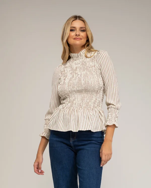 Langdurige gestreepte blouse met honingraatpatroon op de borst en manchetten en volants aan de onderkant.