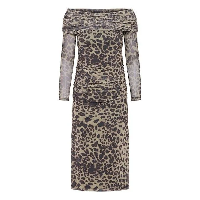Design: Gevoerde zoom/rand, Rechte zoom, Strapless/off-shoulder, Getailleerd model; Halstype: Carmen hals; Motief: Dierenprint; Details: Gedrapeerd; Extra's: All-over patroon, Lichte stof; Lengte: 3/4 lengte; Snit: Getailleerd; Pasvorm: Slanke pasvorm; Armlengte: Lange mouw
