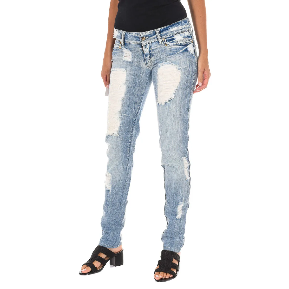 Lange denim broek met gescheurd effect en chiffon D012929-D024 vrouw