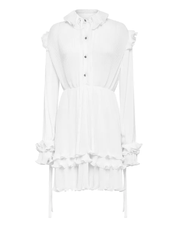 Gewoonweg chique met deze polyester crepon jurk met lange mouwen. Bekijk de volant met sla en de fluwelen bandjes om de kraag en manchetten, met metalen knopen.