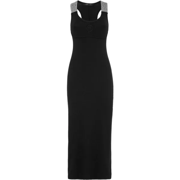 Verfraaid Upgrade your elegance for special times and choose this rib knit jersey slip longuette dress. Check out the details. Rib knit stretch polyester jersey Straps embellished with crystal applications Single vent