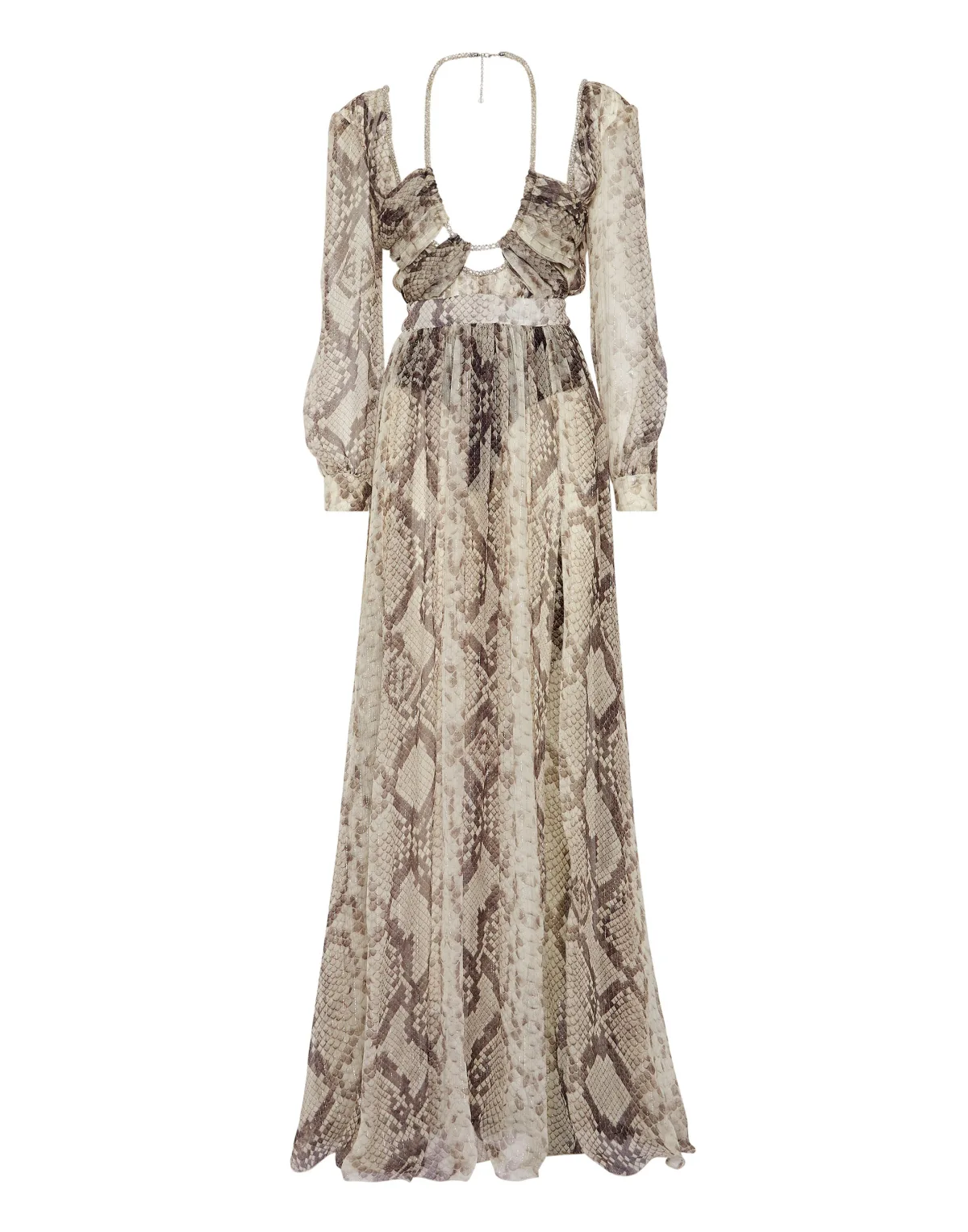 Speciale evenementen vragen om unieke kleding. Wij stellen deze chiffon jurk met lange mouwen voor. Ontdek meer. Pythonprint lichtste chiffon van zijdemix Lurexgaren in de stof laat de jurk glinsteren Diep gedrapeerde halslijn in de taille Laag uitgesneden rug Pofmouwen met manchetten en sierknopen Zwaar gedrapeerd voor beweging en luchtigheid Hoge split links Onzichtbare ritssluiting middenachter
