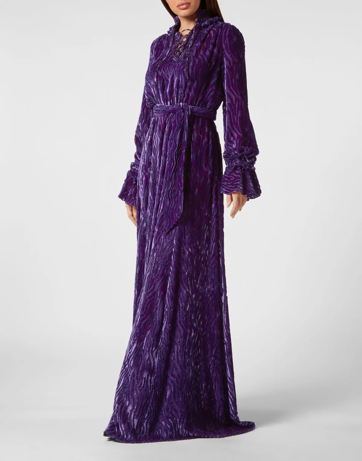 Speciale evenementen vragen om unieke kleding. Wij stellen deze devoré fluwelen jurk met lange mouwen voor. Ontdek meer. Devoréfluweel op lichtste zijdechiffon en rayon Een fluwelen band op de kraag met ruches past het decolleté aan Pofmouwen met volants Strikceintuur in de taille Hoge split rechts