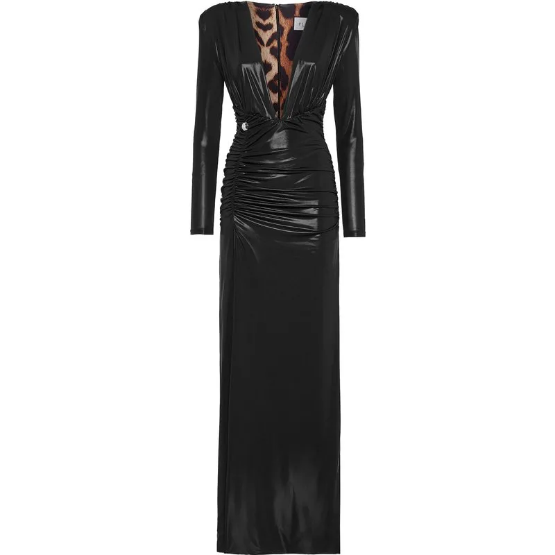Geef je look een vleugje sexy met deze avondjurk in lamé met lange mouwen. Hoogglanzend stretchlamé Pronkende halslijn in taille Drapering Schoudervullingen Open rug Onzichtbare ritssluiting middenachter Hoge zijsplit