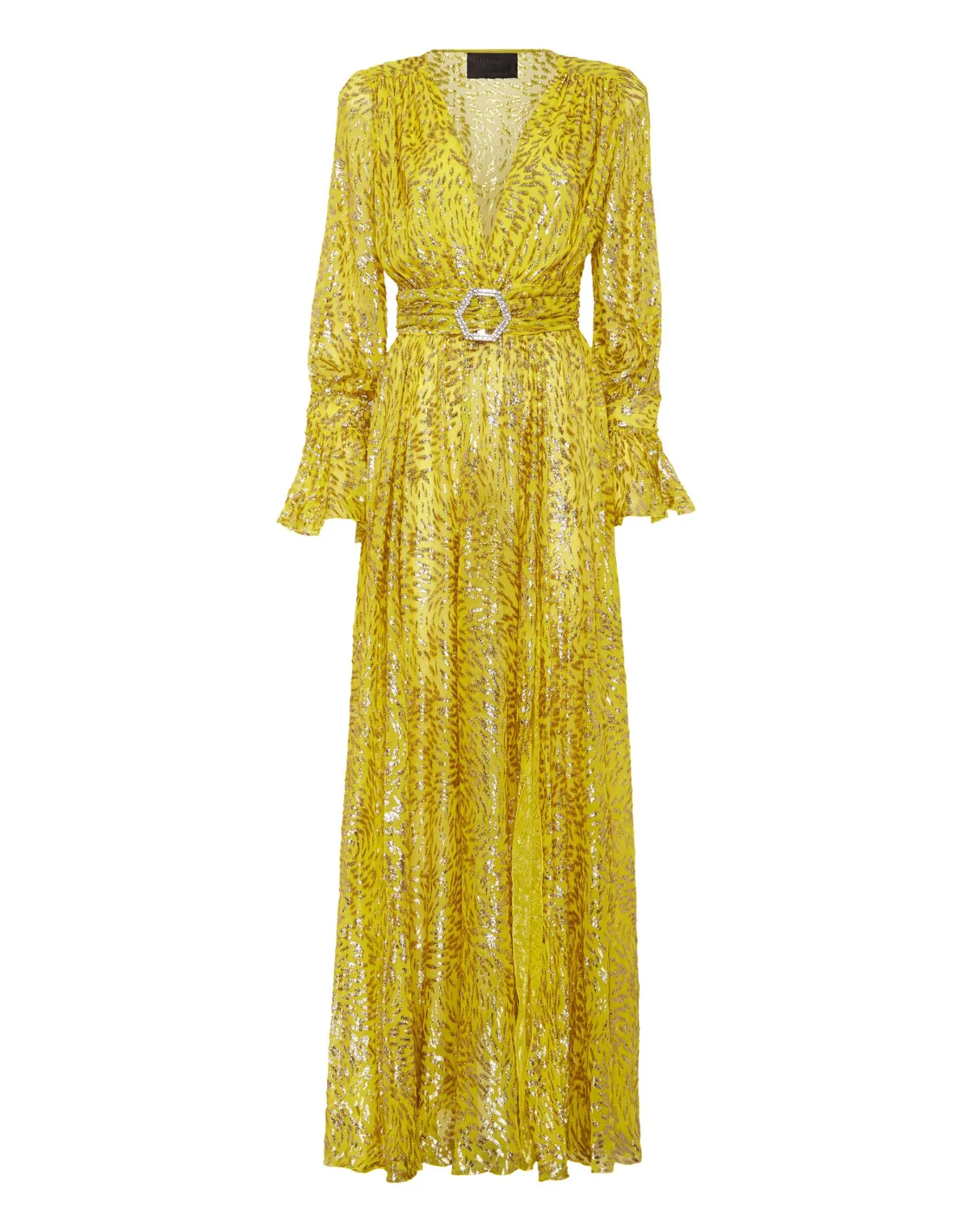 Speciale evenementen vragen om unieke kleding. Wij stellen deze chiffon jurk met lange mouwen voor. Ontdek meer. Lichtste chiffon van zijdemix, all-over versierd met een lurex fil-coupépatroon Pronkende halslijn in de taille met een gesp van juwelen Pofmouwen met volant manchetten en knoopjes van juwelen Gevoerd Hoge split links Uitlopende onderkant Onzichtbare ritssluiting middenachter