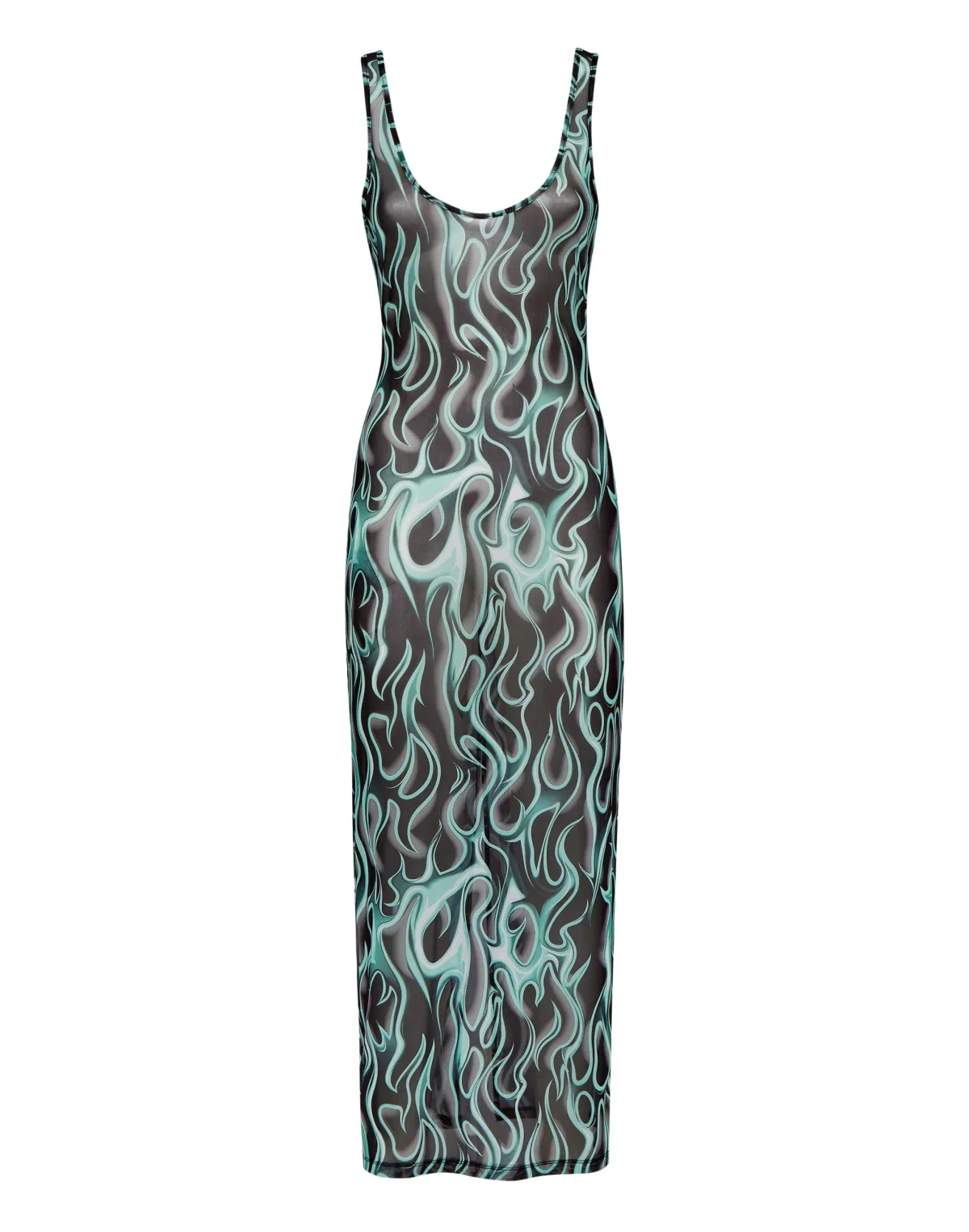 Boost your elegance for your special events with this romantic dress. Check out the details. Flame-print stretch tulle jersey Two needle stitching Figure fitting Slip dress Open back Slit at center back