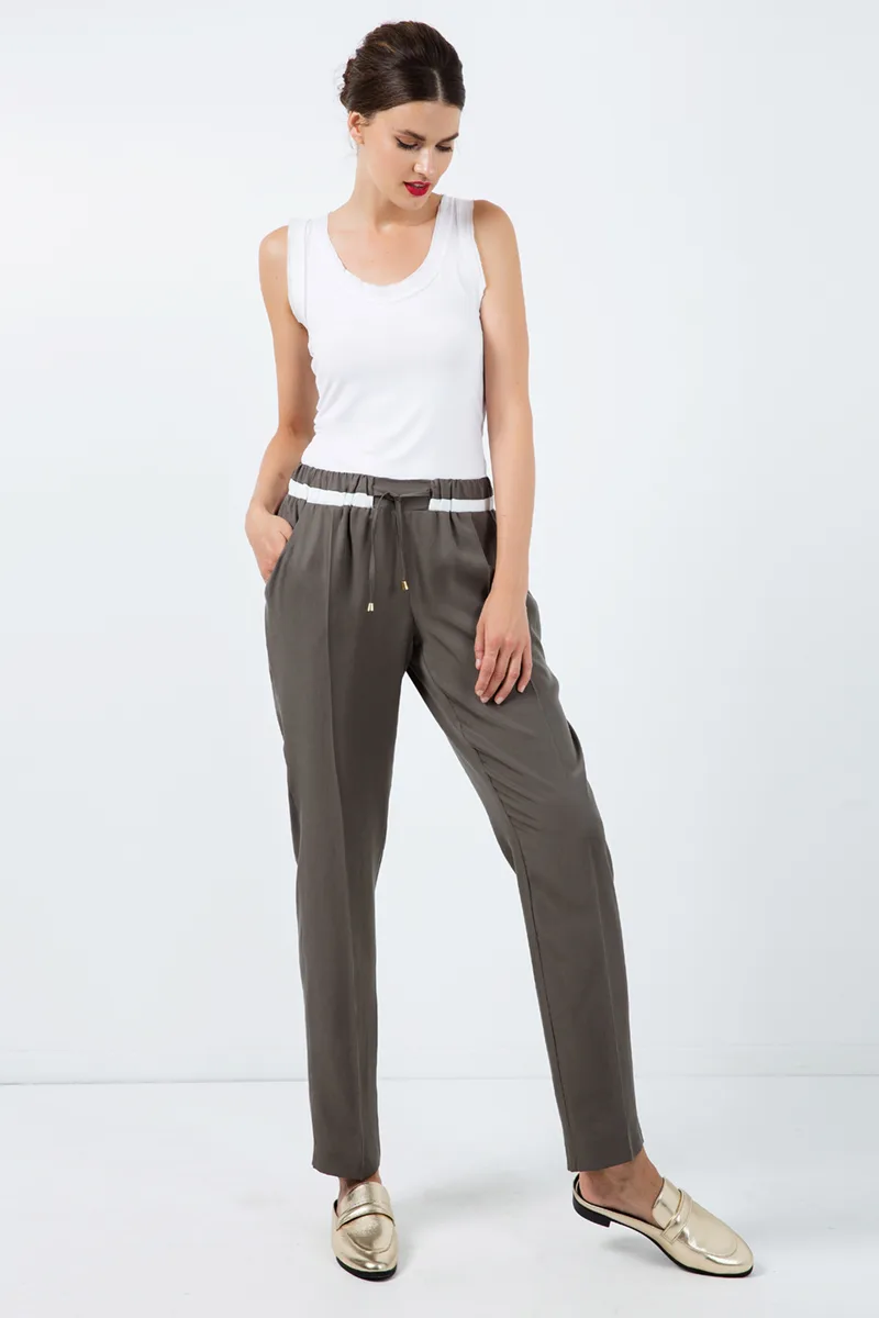 Lange broek van geweven kaki stof, 100% tencel. Elastische taille met twee lengtes van dezelfde stof met metalen stoppers aan het uiteinde die kunnen worden gestrikt. Crèmekleurig decoratief paneel in de taille. Twee schepzakken aan de zijkanten. Ons model heeft een lengte van 178 cm en draagt maat 36. Afmetingen voor maat 38 (in cm):Lichaamslengte-101; Taille-36; Zoomlijn-47. Kledingstuk is loose fit.