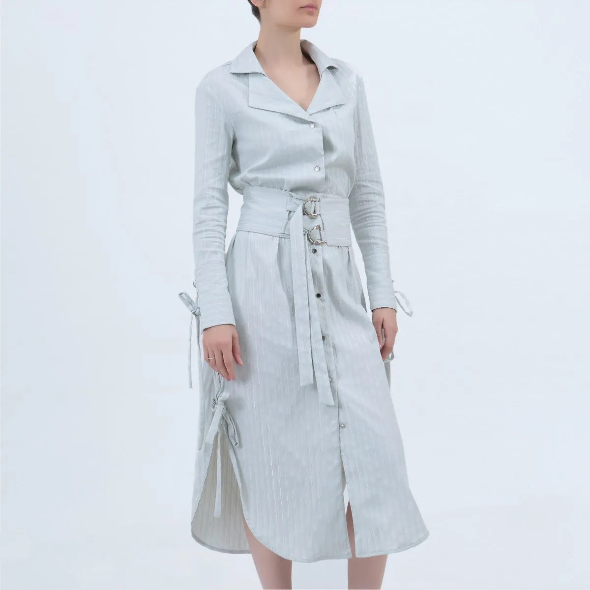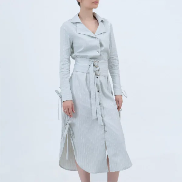 Deze lange shirtjurk in een zeer stijlvol stuk dat je zelf kunt dragen of matchen met een paar getailleerde jeans. Het beschikt over een zeer comfortabel maar stijlvol stretch -katoen met dunne Lurex -strepen. Zeer elegante look verbeterd met de klederkraag, de extra riem en accessorized met enkele oogjes en koorden aan zijkanten en mouwen. Productdetails: • Aanvullende riem verstrekt • Geklassing • Lange mouwen • Lengte: 127 cm • Midden voorgeknoopt