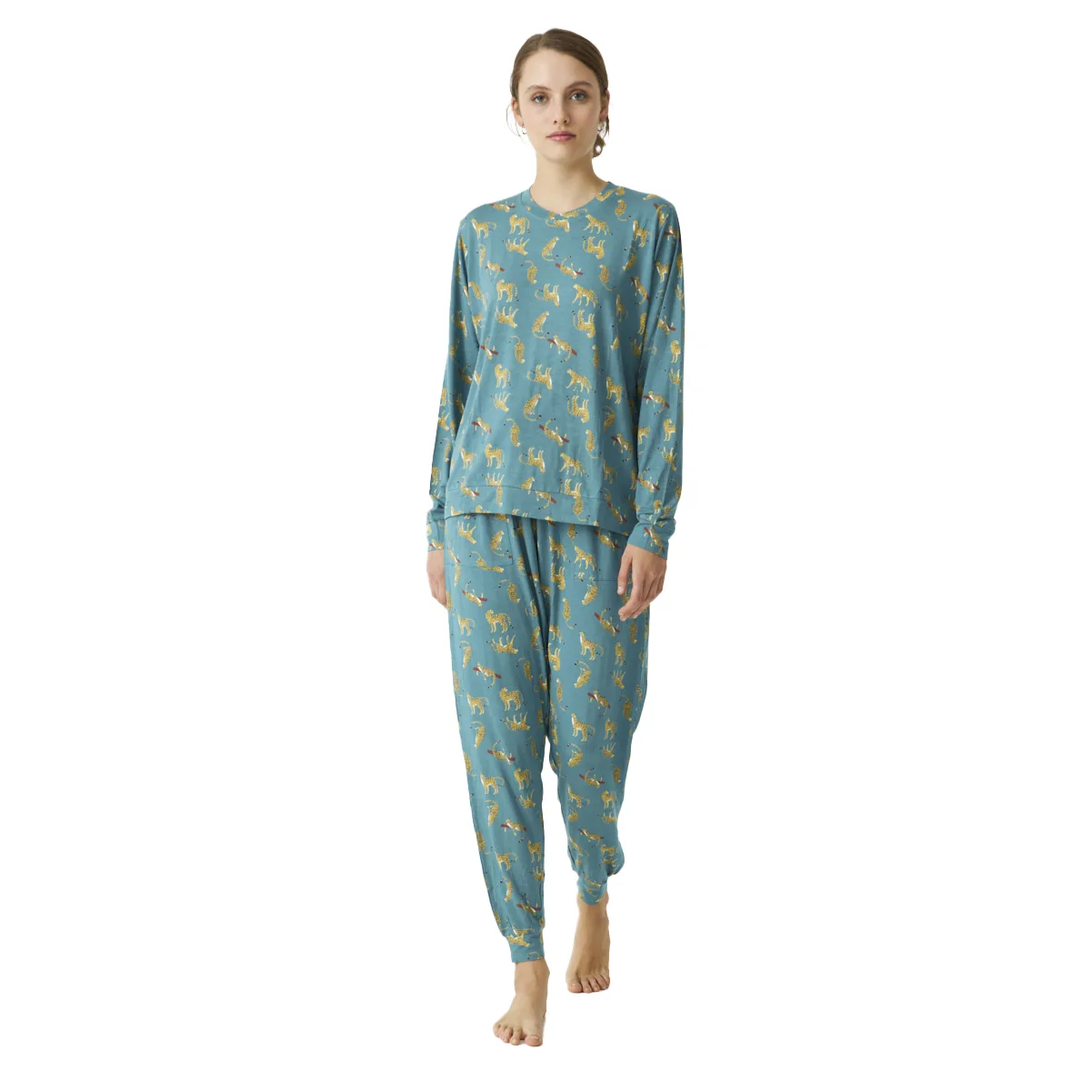 Pyjama met lange mouwen en lange broek van J and J Brothers. Turquoise kleur T-shirt met ronde hals. Zachte textuur. Lange broek met print en elastische tailleband verstelbaar met een trekkoord. Open zakken aan de voorkant. Naden in toon zichtbaar. Samenstelling: T-shirt: 95% Polyester, 5% Elastaan; Broek: 95% Polyester, 5% Elastaan. -Wassen op max. temperatuur. 30º. -Geen bleekmiddel gebruiken. -Strijken op max. temperatuur. 110º. -Chemisch reinigen is niet mogelijk. -Mag niet in de droger. Samenstelling: T-shirt: 95% Polyester, 5% Elastaan; Broek: 95% Polyester, 5% Elastaan. Onderhoud: -Wassen op max. temperatuur. 30º. -Geen bleekmiddel gebruiken. -Strijken op max. temperatuur. 110º. -Chemisch reinigen is niet mogelijk. -Gebruik van een droger is niet toegestaan.