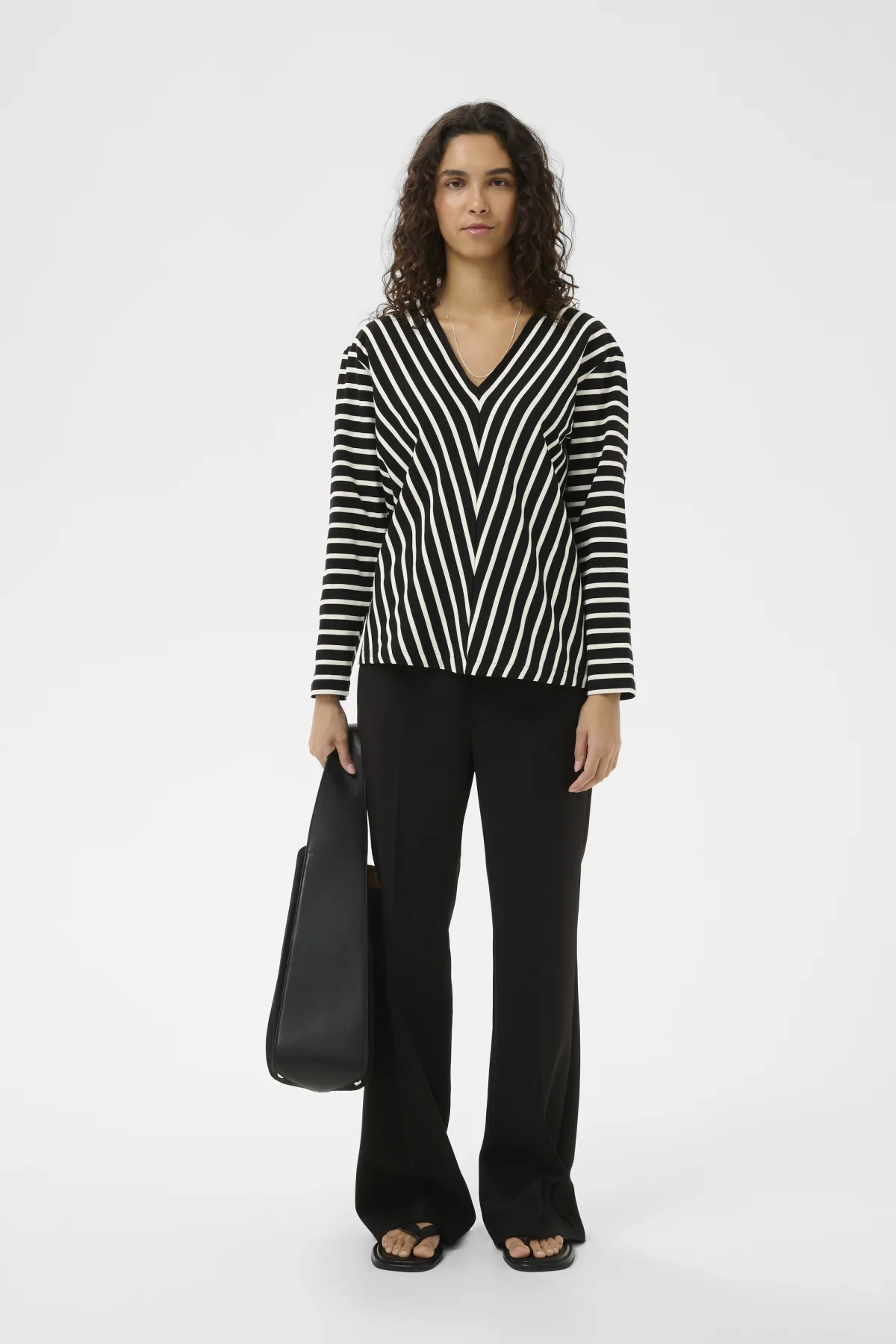 Gestreepte longsleeve top met een opvallende V-hals en visueel sterk streeppatroon. Rechte pasvorm en gladde afwerking geven een frisse moderne uitstraling.