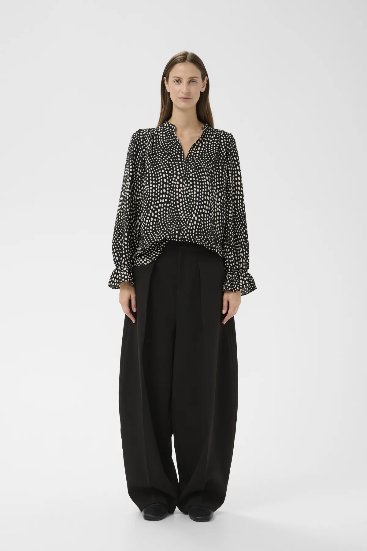 Blouse met polkadots, ontspannen silhouet en V-hals. Licht gerimpelde schouders, lange mouwen met ruches aan de manchet en soepel vallende stof.