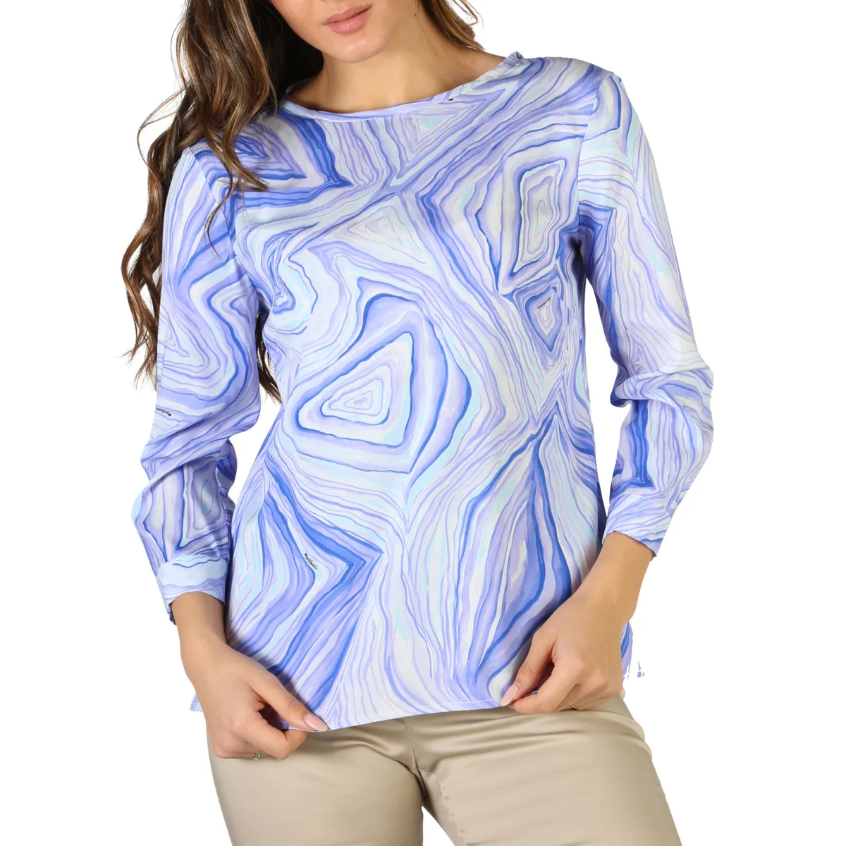 Verhoog je stijl, omarm het comfort. Deze blouse met lange mouwen biedt moeiteloze elegantie voor elke gelegenheid. De relaxte pasvorm zorgt voor comfort de hele dag door, terwijl de betoverende marmerprint in tinten blauw, paars en wit een vleugje verfijning aan je look toevoegt. De flatterende ronde hals biedt een comfortabele en stijlvolle pasvorm. Draag het voor formele evenementen of casual uitjes; het veelzijdige ontwerp past naadloos in je levensstijl. Ervaar de perfecte combinatie van stijl en comfort.