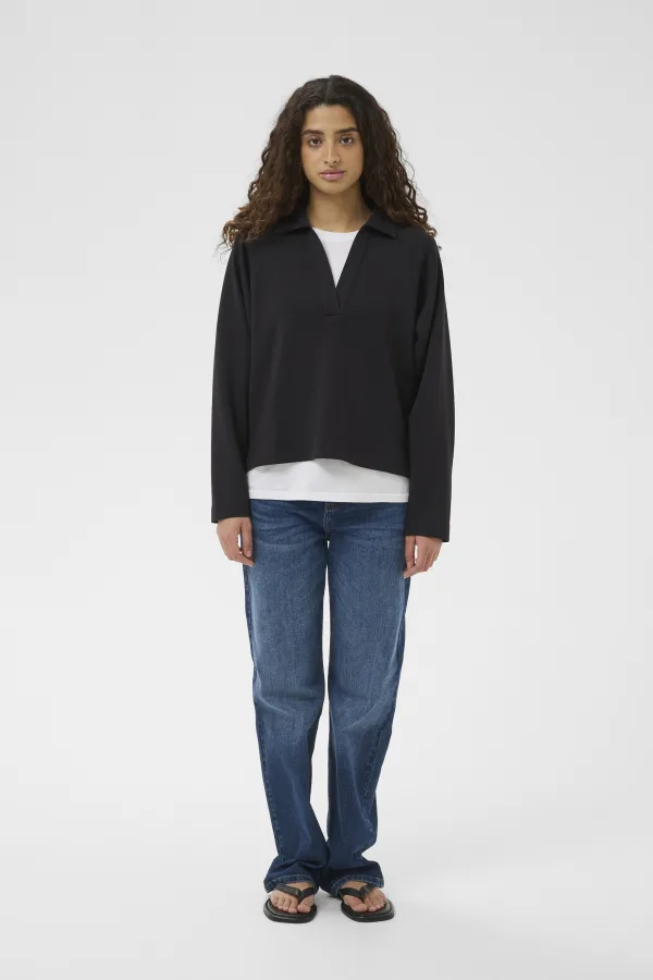 Lange mouwen polo top met een rechte, relaxte pasvorm. Diepe V-hals, open kraag, verlaagde schouders en een strakke, eenvoudige uitstraling.