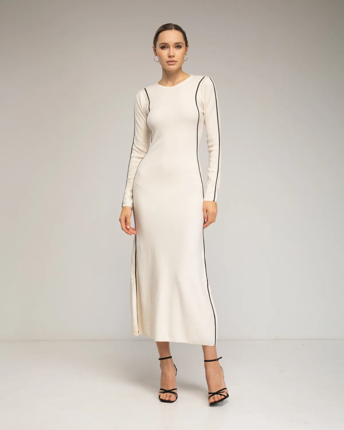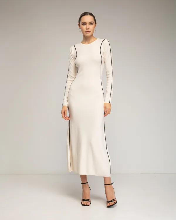 Lange, nauwsluitende gebreide jurk met verticale lijnen