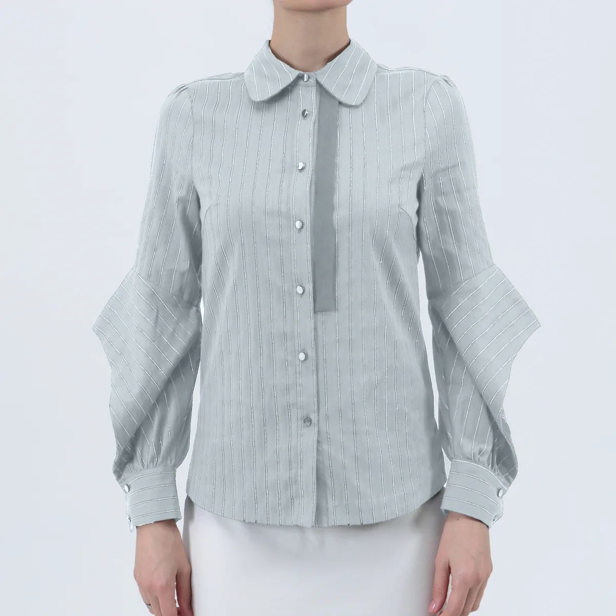 Uniek ontwerpverklaring met de originele mouwvorm en de satijnen flap op de voorste placket, dit shirt stelt je in staat om er zowel slim als trendy uit te zien. Comfortabel met zijn stretch katoen en toch verfijnd met de dunne Lurex -strepen. Een item dat bij veel verschillende rokken en broeken past, geschikt voor zowel werk, dag als evenementen. Productdetails: • Kraag • Lange mouwen • Lengte: 65 cm • Midden voorgeknoopt