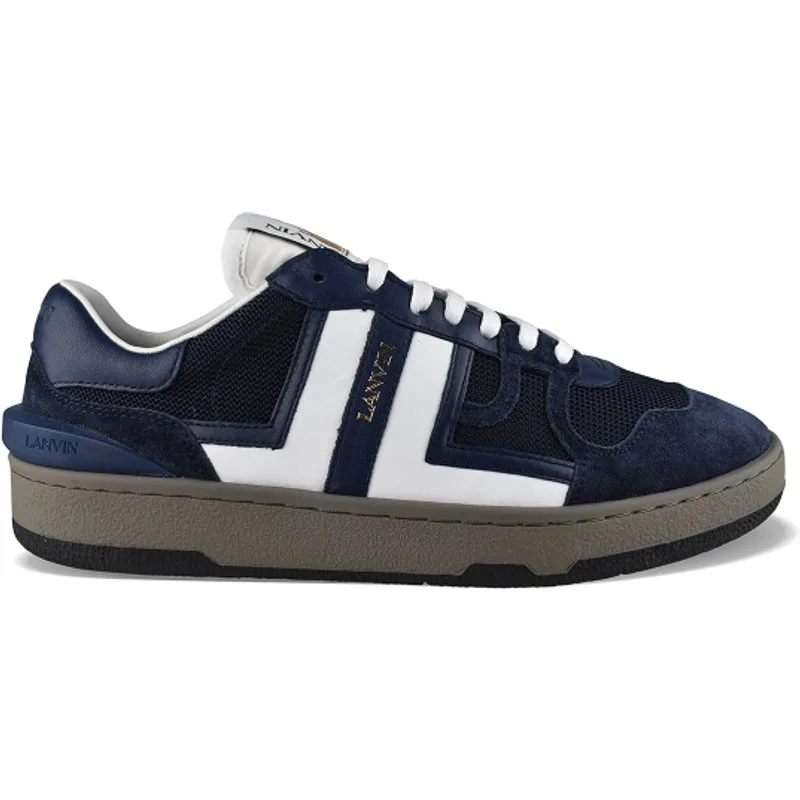 Clay sneakers van marineblauw leer en suède Lanvin.Wit leren juk.Logo in gouden letters op zijkant.Tong met logopatch.Witte vetersluiting.Bruine rubberen zool.Made in Italy.