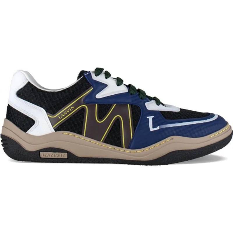 Lanvin zwarte mesh sneakers.Blauwe en bruine inzetstukken met logodetails.Wit lederen teller.Groene vetersluiting.Beige en zwarte rubberen zool.Gemaakt in Italië.