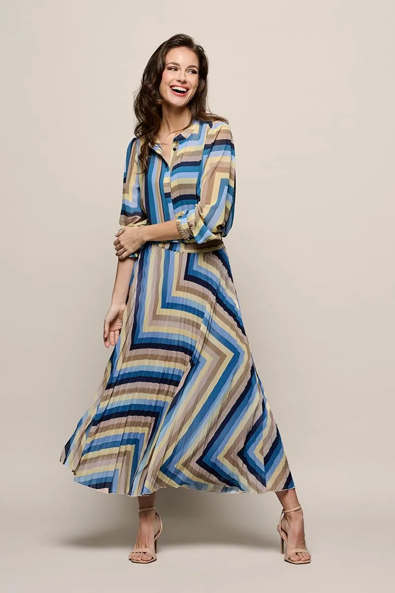 Elegante lange plissé rok in blauwDe Lara plissé rok is een lange damesrok met een verfijnd, geplisseerd ontwerp en een opvallend, kleurrijk zigzagpatroon. De wijdvallende pasvorm combineert stijl en comfort en valt elegant net boven de enkel, waardoor de rok bij iedere stap luchtig en vloeiend meebeweegt.De fijne plooien geven een vrouwelijke uitstraling en maken de rok geschikt voor zowel casual als chique outfits. Gemaakt van 100% polyester met een zachte voering van 100% viscose, biedt deze rok stevigheid, draagcomfort en een perfecte pasvorm. De non-stretch kwaliteit houdt de plooien mooi strak en behoudt de levendige zigzagprint.Met zijn frisse blauwtinten, tijdloze plisséstructuur en vloeiende silhouet is deze zomerrok een stijlvolle toevoeging aan elke garderobe. Dankzij de veelzijdigheid laat de Lara plissé rok zich eenvoudig combineren met andere essentials en is het een echte must-have in de collectie dameskleding.