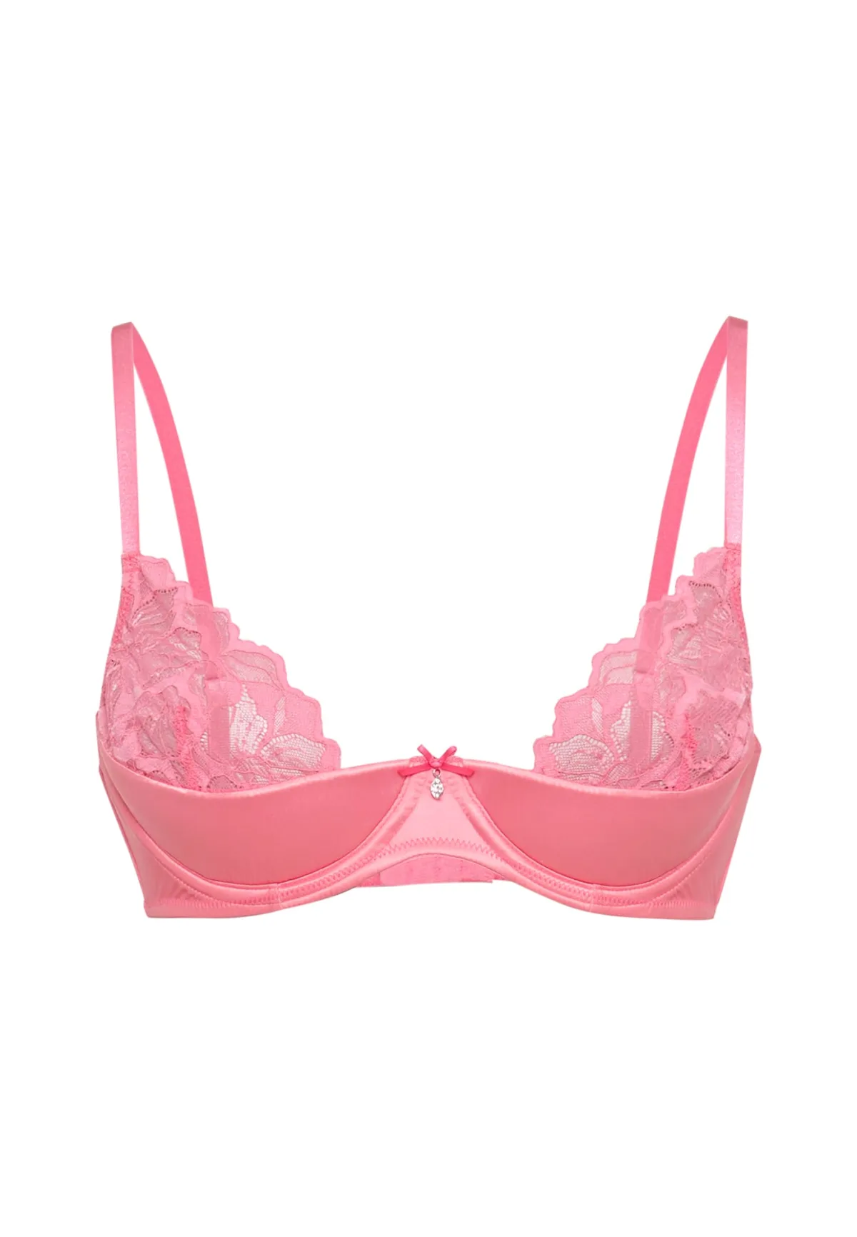 Cup soorten: Kwart cup bh; Soort bandjes: Normale bandjes; Bh/bikini type: T-shirt; Beugel: Met beugel; Design: Gevoerde zoom/rand; Type sluiting: Haakjes; Materiaal: Satijn; Motief: Bloemenprint; Details: Kant; Extra's: Licht transparant, Op staal naden