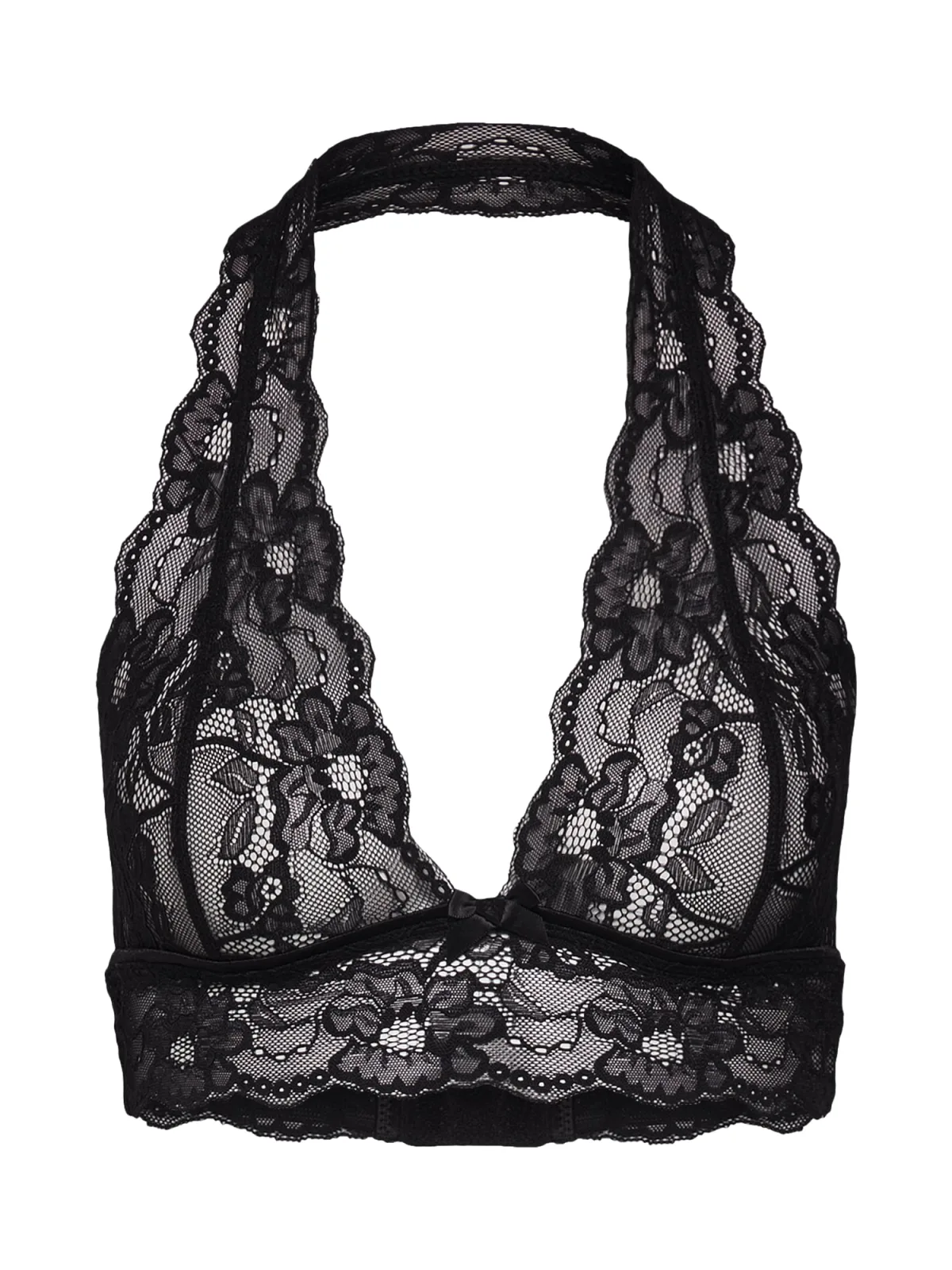 Cup soorten: Soft cup bh; Soort bandjes: Halterbandjes; Bh/bikini type: Triangel; Beugel: Zonder beugel; Motief: Bloemenprint; Details: Kant, Backless; Extra's: Licht transparant, Wijdte verstelbaar