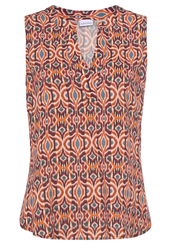Blouse type: Wijde blouse; Design: Gevoerde zoom/rand; Materiaal: Viscose; Motief: Aztec print; Kraag: Tuniek kraag; Extra's: All-over patroon, Gladde stof; Pasvorm: Losse pasvorm; Armlengte: Mouwloos; Lengte: Normale lengte