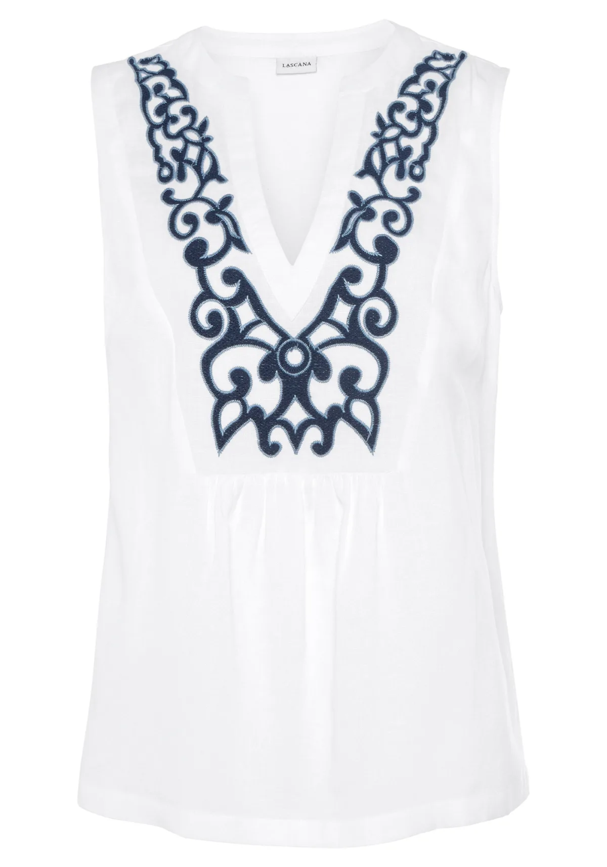 Blouse type: Wijde blouse; Design: Diepe snit/decolleté; Materiaal: Viscose; Kraag: Zonder kraag; Details: Borduursels; Extra's: Lichte stof; Pasvorm: Normale pasvorm; Armlengte: Mouwloos; Lengte: Normale lengte