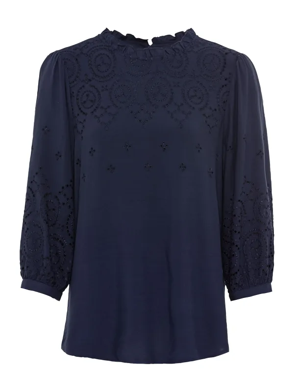 Blouse type: Blouseshirt; Design: Gevoerde zoom/rand; Type sluiting: Knoopsluiting; Materiaal: Viscose; Motief: Effen; Kraag: Opstaande kraag; Details: Cut-outs, Ruches, Borduursels, Mesh; Extra's: Op staal naden; Pasvorm: Losse pasvorm; Armlengte: Lange mouw; Lengte: Normale lengte