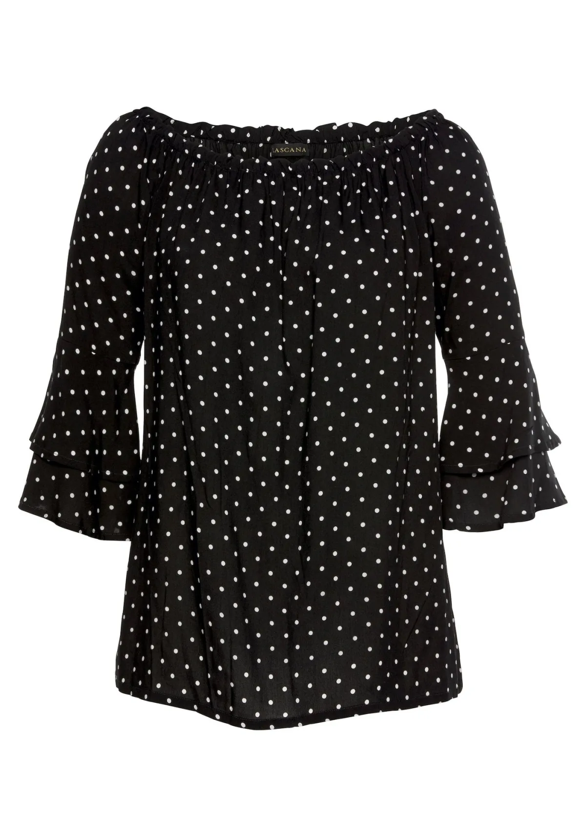 Blouse type: Blouseshirt; Design: Ronde zoom; Materiaal: Viscose; Motief: Gestippeld; Kraag: Zonder kraag; Details: Volant; Extra's: Voelt zacht aan; Pasvorm: Normale pasvorm; Armlengte: Lange mouw; Lengte: Normale lengte