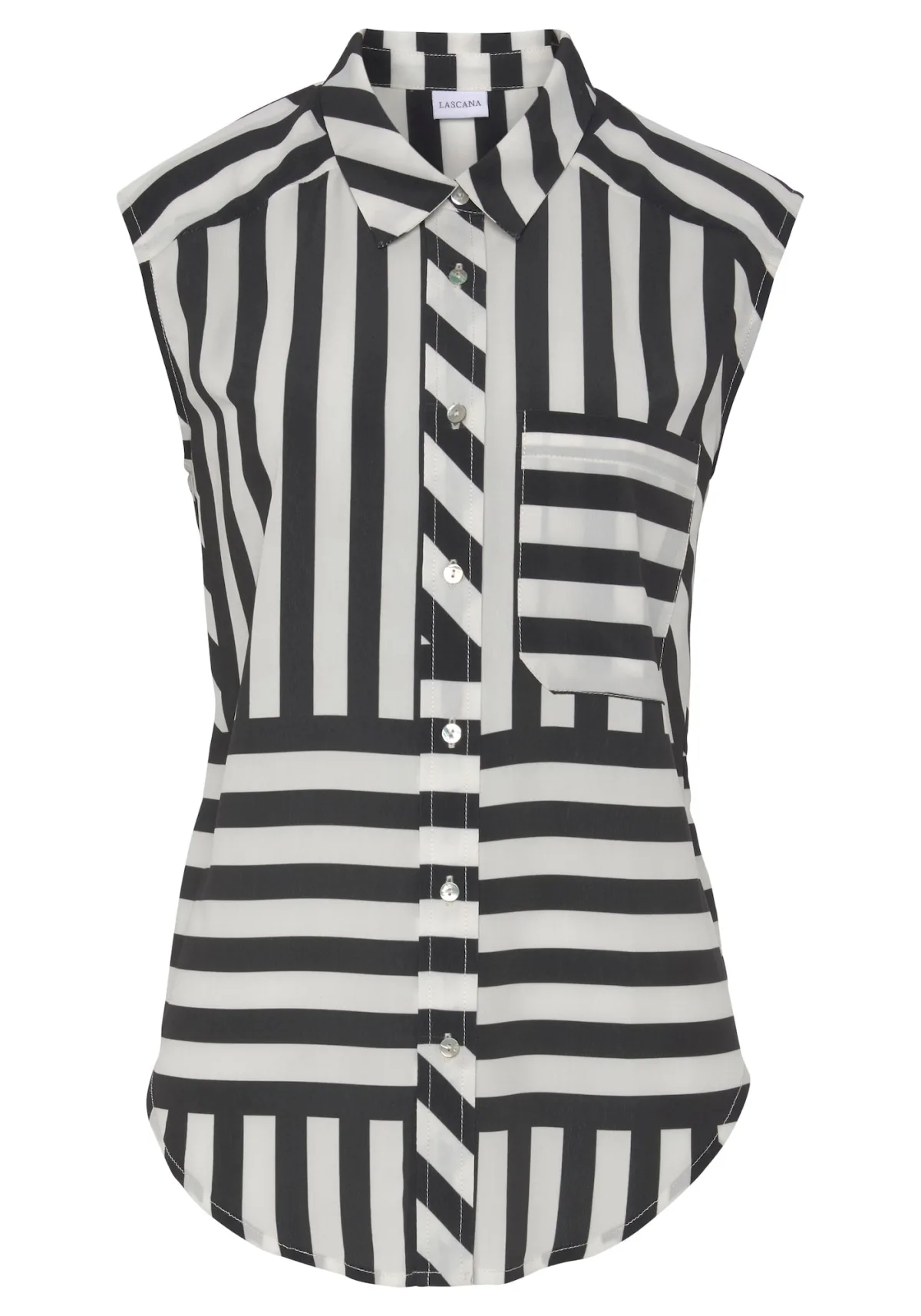 Blouse type: Klassieke blouse; Design: Gevoerde zoom/rand, Knop placket; Type sluiting: Knoopsluiting; Materiaal: Gerecycled materiaal; Motief: Gestreept; Kraag: Kentkraag; Extra's: All-over patroon; Pasvorm: Losse pasvorm; Armlengte: Mouwloos; Lengte: Normale lengte