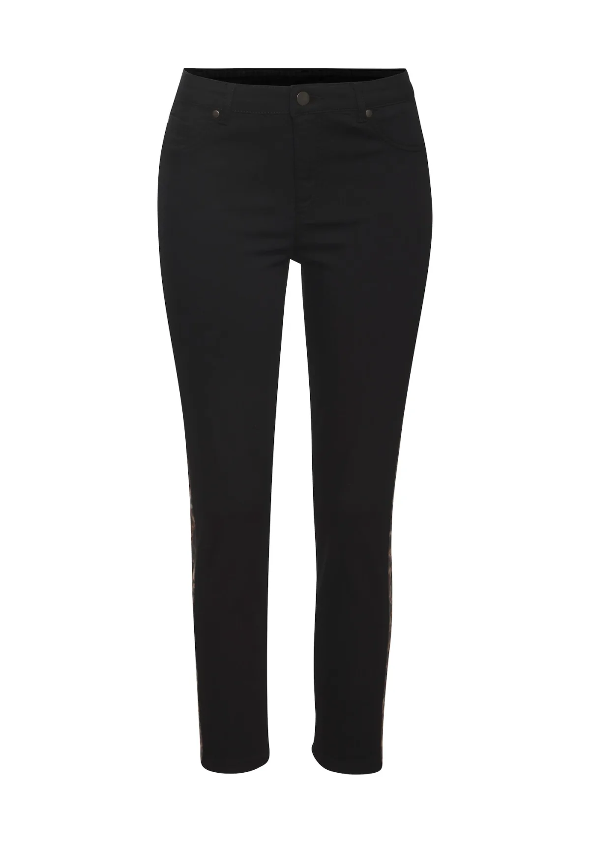 Design: Ritssluiting, 5-pocket-style, Knop sluiting; Type sluiting: Knoopsluiting; Materiaal: Denim; Motief: Dierenprint; Details: Zijstrepen; Extra's: Studs, Op staal naden, Riemlussen; Wassing: Raw/unwashed; Lengte: 7/8 lengte; Pasvorm: Slimfit; Taillehoogte: Mid waist